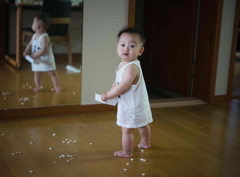 과자를 바닥에 뿌려 놀던 태하가 아빠에게 들킨 모습입니다. 아이의 얼굴엔 잘못됐다는 걸 아는 듯 한 당황스러움이 보여요. 여러분도 비슷한 상황에 서면 그 순간 카메라를 조용히 켜고 아이의 이름을 불러 주세요. 그리고 그 사랑스러운 순간을 남겨 보세요.