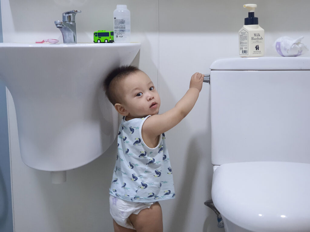 첫째가 10개월 쯤 되었을 때, 변기 물을 내리며 장난을 치는 모습입니다. 물이 내려가는 것이 신기한지 멈추질 않았죠. 아래에 있는 사진에서 둘째 역시 첫째처럼 따라 하는 모습을 확인할 수 있습니다.