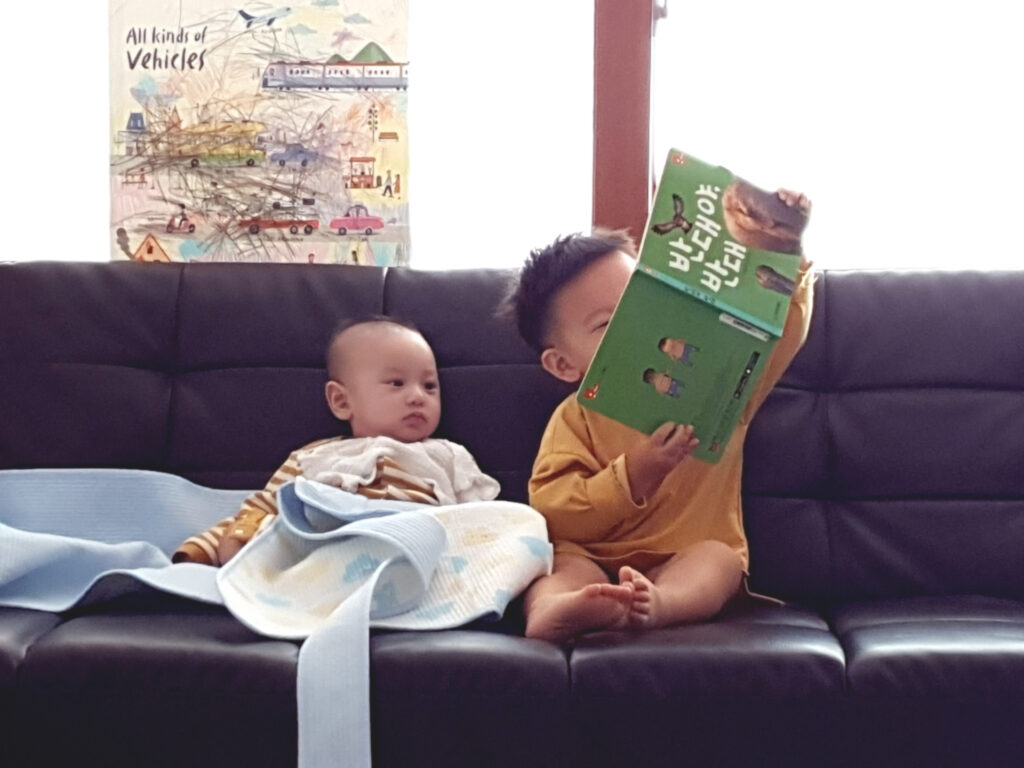 첫째가 동생에게 책을 읽어 주는 동안, 엄마와 아빠는 이를 빌미로 짧은 숨을 돌리곤 합니다. 첫째 덕분에 조금 든든함이 느껴졌으나, 아쉽게도 태하의 책 읽기는 5분 이상 이어지질 않았습니다. 그렇지만 형과 동생이 같이 보내는 그 소중한 시간은 무척 사랑스러웠습니다.