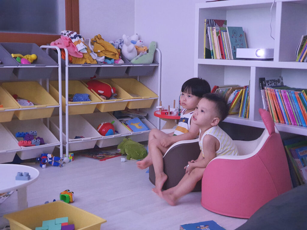 이 사진은 태하와 유하가 뽀로로 만화를 시청하고 있는 모습인데요, 첫째 태하는 긴장감 넘치는 쫓기는 장면을 흥미진진하게 빠져 있는 반면, 둘째는 이 장면이 조금 무서운 지 울고 있는 사진입니다. 동일한 만화를 보더라도 다양한 반응을 보여주는 첫째와 둘째의 모습은 신기했습니다.
